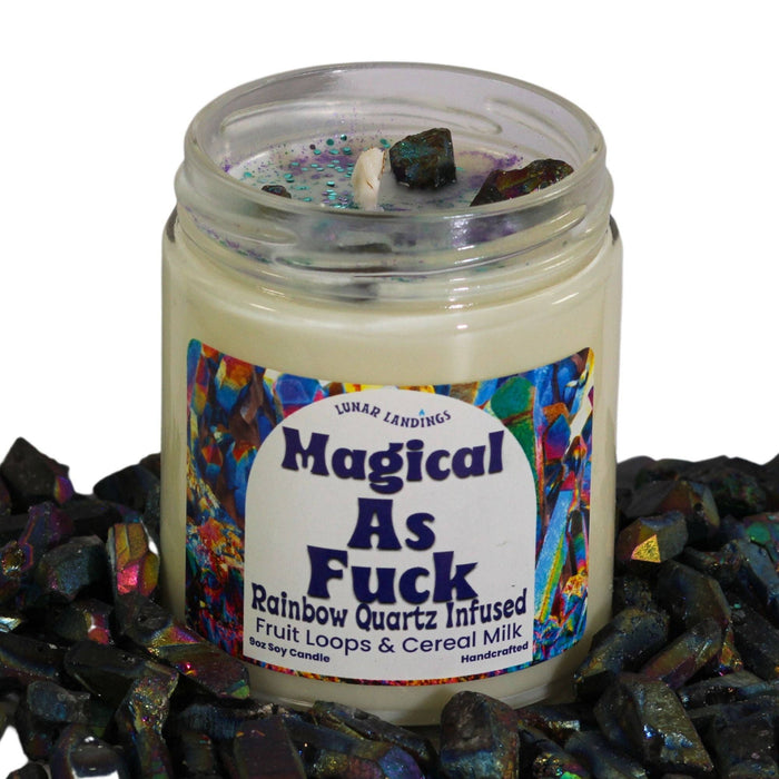 Our Titanium Rainbow Aura Quartz Soy Candle is infused with lots of love and crystal energy. <3 Adorned with biodegradable glitter as well! The back label displays the wonderful metaphysical properties of Rainbow Aura Quartz. Once your soy candles burns down, you get to keep your crystals! Each 9oz soy candle come with 4 Rainbow Aura Quartz pieces. (Small hole drilled at bases for easy craft/ jewelry re-purposing if you would like.