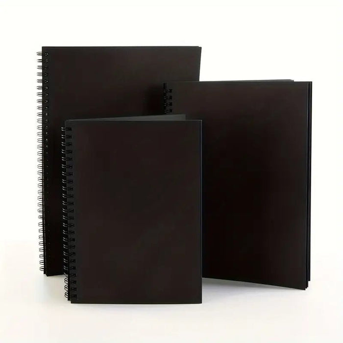 Hardcover, all black pages, spiral bound. For artists and crafters. Excellent for white pencils and inks, gel pens and light paints.